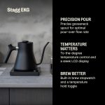 دقت آسان: با کنترل دما تا درجه‌ی دلخواه و زمان گرمایش سریع، Stagg EKG Pro دقیقاً در زمان و نحوه‌ی مورد نیاز شما آب را گرم می‌کند. از دمای ۲۰۵ درجه فارنهایت (حدود ۲۲۰ درجه سانتیگراد) تا ۱۸۰ درجه فارنهایت (حدود ۱۸۰ درجه سانتیگراد)، دقت همیشه در دسترس شماست.
